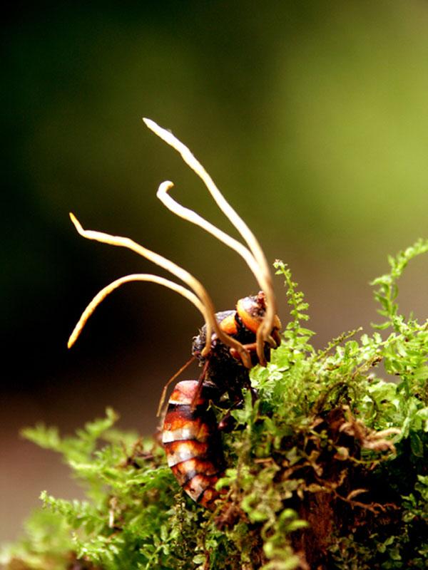 동충하초의 숙주(宿主)가 되는 곤충은 매미, 나비, 개미, 벌, 잠자리, 딱정벌레 등 다양하며